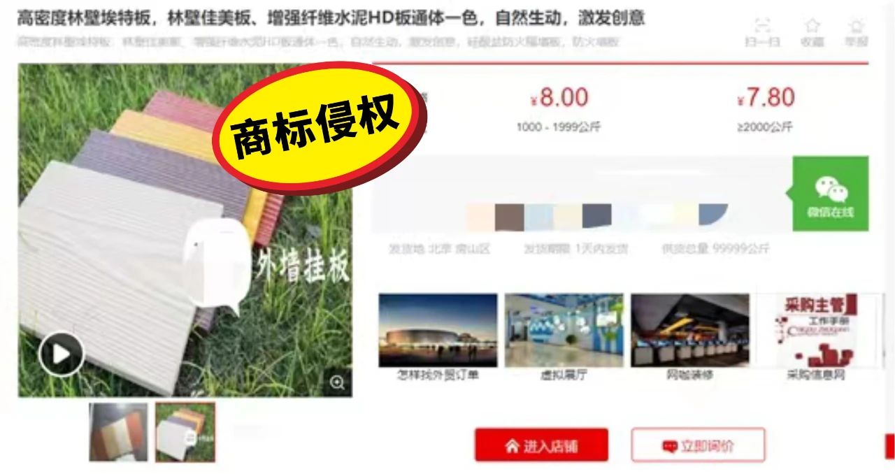在本案中�“北京中工林壁板業有限公司”在“杭州商易信息技術有限公司�經營�“建材網�上進行建筑板材產品的招商推廣,大量使用了“埃特”、“埃特佳美”、“佳壁”、“賽迪”及“佳萊”等,同時也��1688批發網”、“九正建材網”�"中國供應商網�等平臺上銷售、招商推廣其板材產品,同樣大量使用“埃特”、“埃特佳美”、“佳壁”、“賽迪”及“佳萊”等標記,相關侵權及不正當競爭行為的部分證據如下�